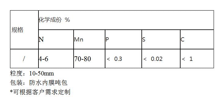 江苏氮化锰铁采用中碳锰铁、电解金属锰、氮气制得江苏氮化锰铁(氮化金属锰)。江苏氮化锰铁是优良的炼钢添加剂,能提高钢的强度等机械性能,细化晶粒,稳定奥氏体,在高强度低合金钢的冶炼中广泛应用。氮化金属锰作为氮和锰的合金添加剂,主要用于生产高强度钢、不锈钢、耐热钢等产品。