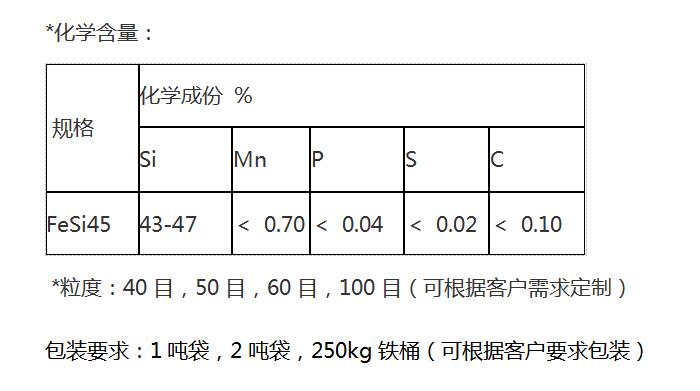 江苏45雾化硅铁的化学名称是45雾化硅铁,采用的生产工艺是电炉冶炼,真空水雾化处理,烘干,筛分。一般情况下,45雾化硅铁主要用于焊接材料方面,特种电焊条生产药皮中辅料的一种。